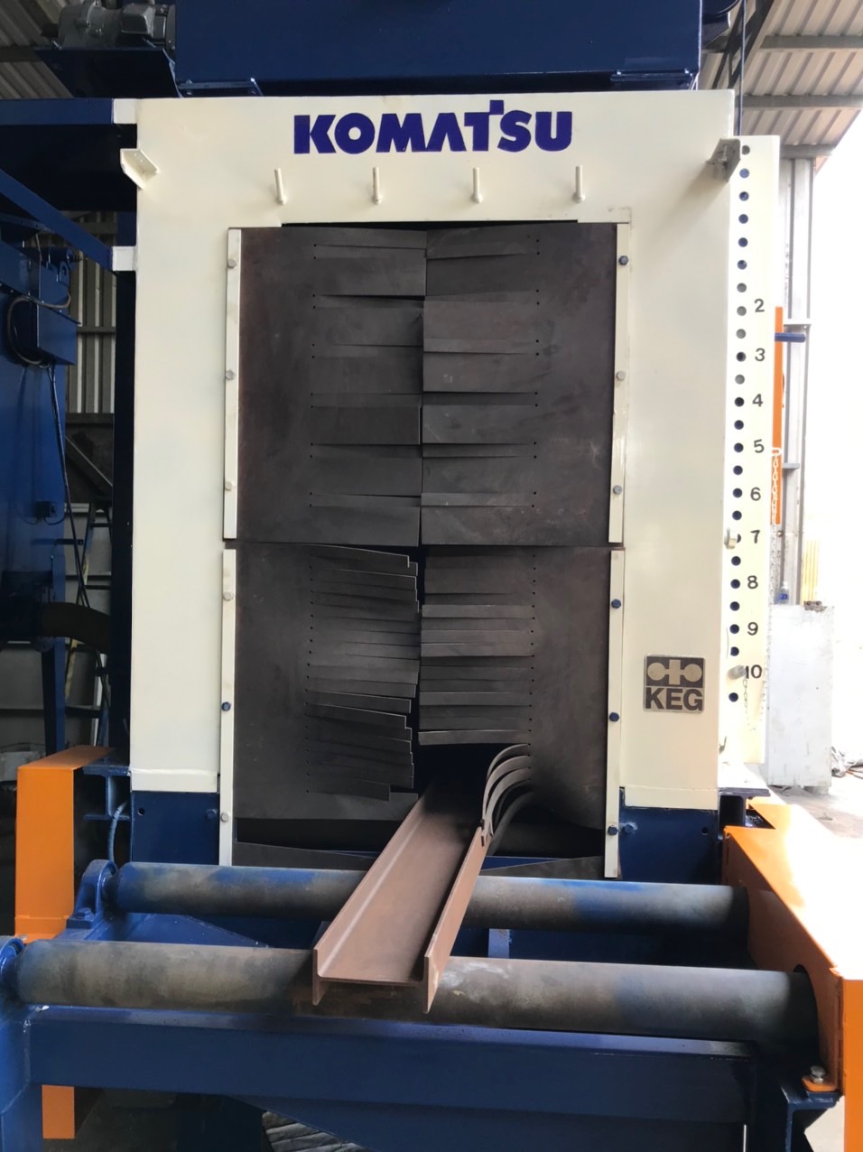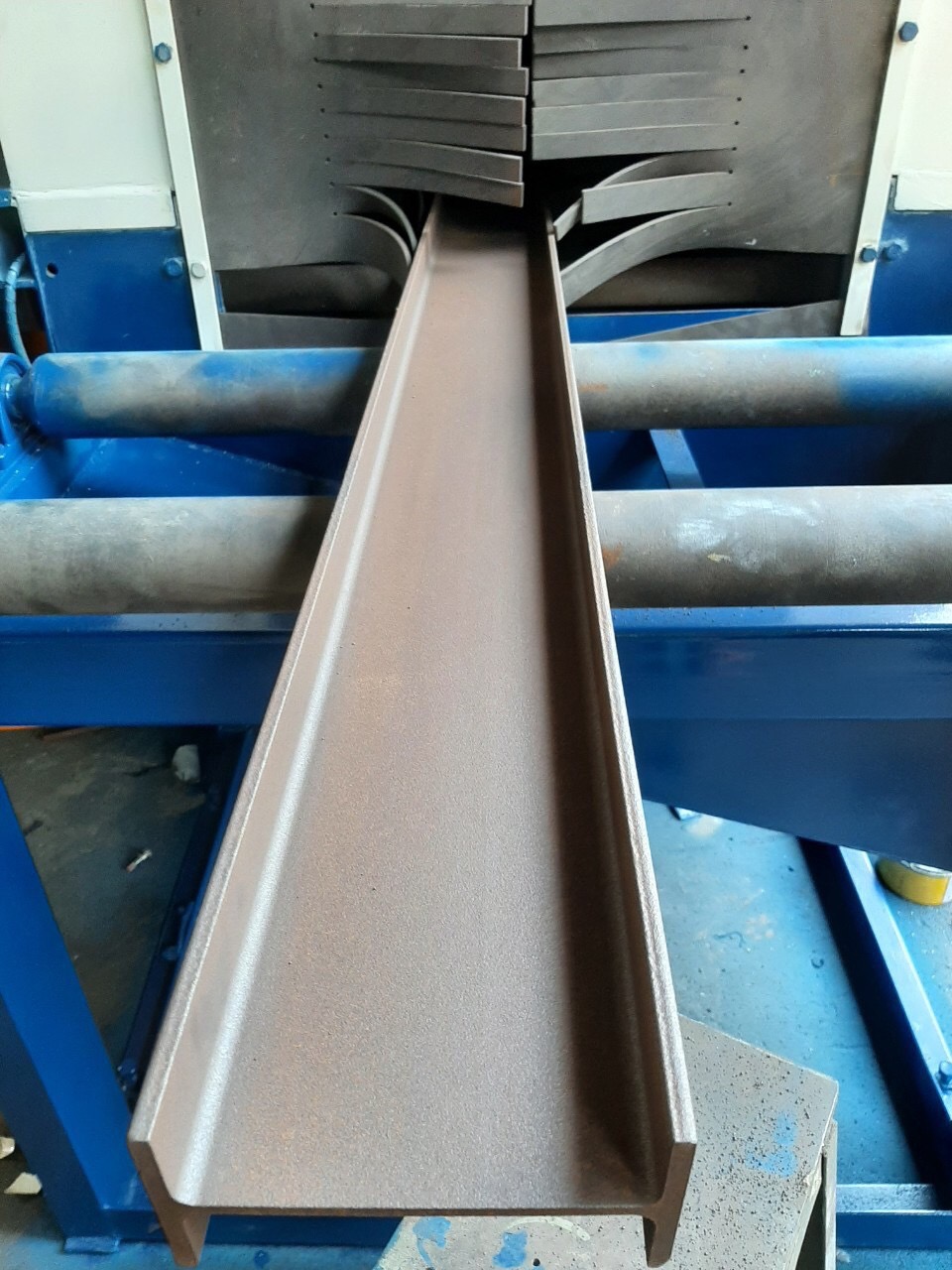 Máy làm sạch thép chữ H là một sản phẩm thuộc loại thiết bị phun bi, được áp dụng để làm sạch bề mặt của kết cấu thép hàn mảnh công việc, thép kiểu H, tấm và các cấu hình khác.